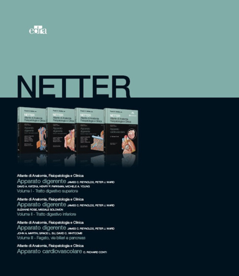 La collana degli Atlanti Netter, caratterizzata dall’inserimento delle nozioni di base di anatomia, fisiologia e patologia in un contesto clinico, viene completata con la pubblicazione degli ultimi tre volumi dedicati all’apparato digerente. I volumi sono stati totalmente riscritti e rinnovati con l’aggiunta di decine di moderne immagini radiografiche ed endoscopiche ; sono state affrontate nuove patologie, attualmente comuni ma che al momento della stesura della prima edizione non erano note, fra cui l’esofago di Barrett e l’esofago eosinofilo e sono state introdotte nuove prospettive sulla deglutizione e sulla neurofisologia della funzione gastrica. Per l' Apparato cardiovascolare : le tavole di Netter sono accompagnate da un testo conciso illustrano sia le nozioni di base (anatomia , fisiologia , epidemiologia ) che la clinica con informazioni aggiornate sulla diagnosi e la terapia delle principali patologie.
