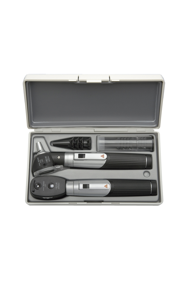 Set Mini 3000 LED con: Oftalmoscopio mini 3000 LED, Otoscopio mini 3000 LED a F.O., 1 set di 4 speculum riutilizzabili, speculum monouso AllSpec da 2,5 e 4 mm Ø e astuccio rigido cod. D-886.11.021