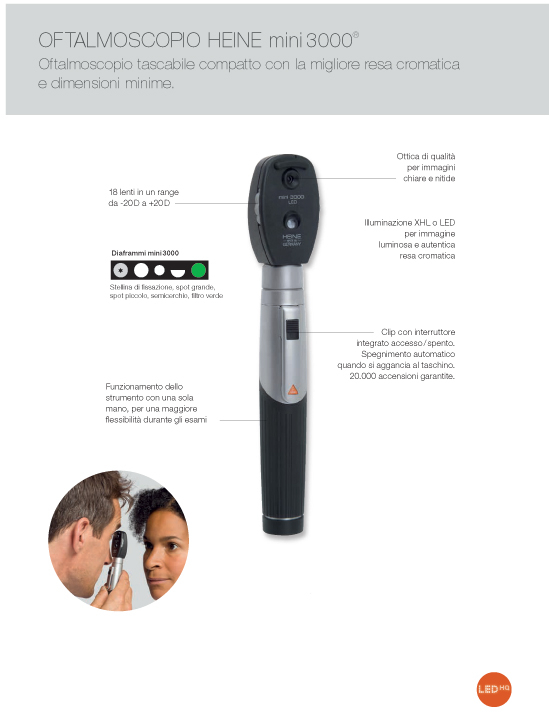 Oftalmoscopio moderno con illuminazione LED che non richiede interventi di manutenzione. Simile ad un oftalmoscopio XHL Xenon alogeno HEINE per luminosità e resa cromatica. Caratteristiche uguali all’oftalmoscopio mini3000, tuttavia: Non sono necessari interventi di manutenzione, in quanto non occorre sostituire il LED. Gestione del calore LED per una luminosità costante per l’intera durata operativa. LED ad alto rendimento: Illuminazione assolutamente uniforme e chiara con eccezionale resa cromatica – temperatura del colore: 4000 K, indice di resa cromatica > 95, per resa dei toni del rosso > 90. Indicatore di performance: Massima intensità luminosa all’accensione dello strumento. Successivo adattamento della luminosità al livello di caricamento effettivo della batteria. La funzione fade-out segnala la necessità della sostituzione o ricarica delle batterie. Durata di funzionamento fino a 10 ore. Meno sostituzioni batterie, durata prolungata delle batterie ricaricabili.