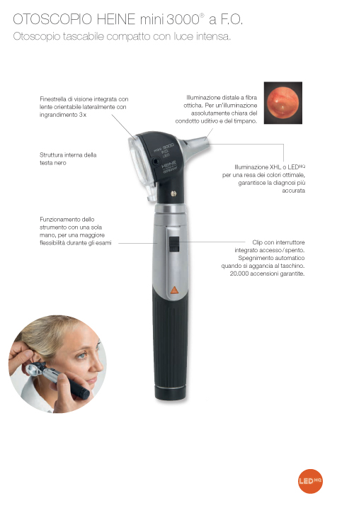 Otoscopio moderno con illuminazione LED che non richiede interventi di manutenzione. Doppia luminosità rispetto ad un otoscopio alogeno XHL Xenon tradizionale. Stesse caratteristiche dell’otoscopio mini3000 F.O., tuttavia: Non sono necessari interventi di manutenzione, in quanto non occorre sostituire la lampadina. Gestione del calore LED per una luminosità costante nel corso dell’intera durata operativa. LED ad alto rendimento Illuminazione assolutamente uniforme e chiara con eccezionale resa cromatica – temperatura del colore: 4000 K, indice di resa cromatica > 95, per resa dei toni del rosso > 90. Doppia luminosità rispetto ad un otoscopio alogeno XHL Xenon tradizionale. Indicatore di performance: Massima intensità luminosa all’accensione dell’apparecchio.