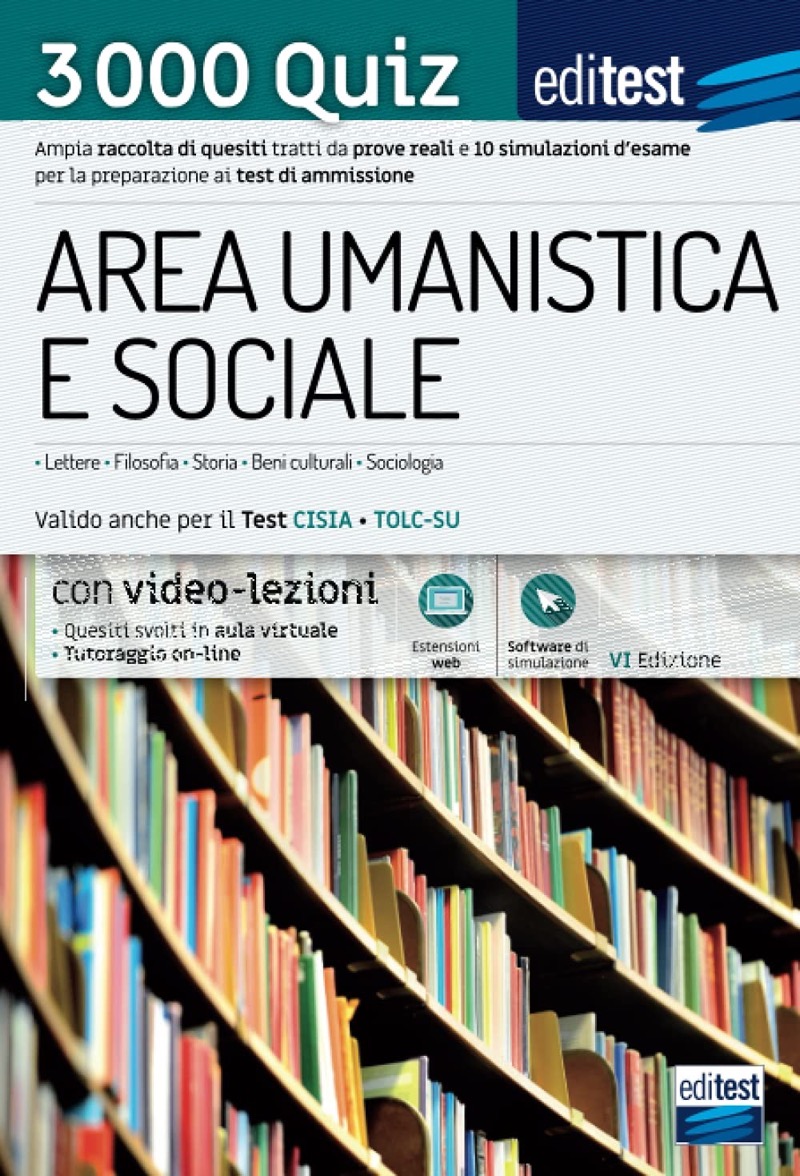 La raccolta di 3.000 quiz EdiTEST per la preparazione ai test di ammissione ai corsi di laurea di Area umanistica e sociale (lettere, filosofia, storia, beni culturali, sociologia, tolc-su) contiene quesiti suddivisi per materia (logica, cultura generale, cultura storico-letteraria) e dieci simulazioni d’esame.