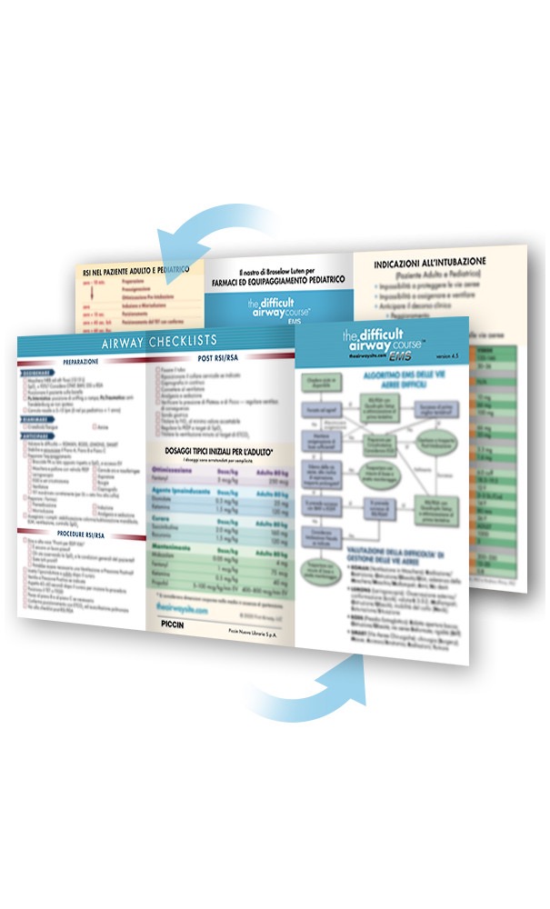 Contiene tutte le informazioni essenziali per la gestione delle vie aeree in anestesia, con gli algoritmi e i vari mnemonici accompagnati da figure a colori e istruzioni per la gestione di un’emergenza CICO: paziente non intubabile/non ossigenabile.